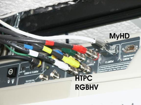 -From the RGBHV output of the MyHD card, via a CAT5 VGA cable to port 3 of the projector. Source material for the MyHD card can be through its tuner for live HDTV, or from a pre-recorded file on the HTPC (big files! 1 hour of HD take 9 GB!) or from the D-VHS deck via an IEEE 1394 (FireWire) connection.