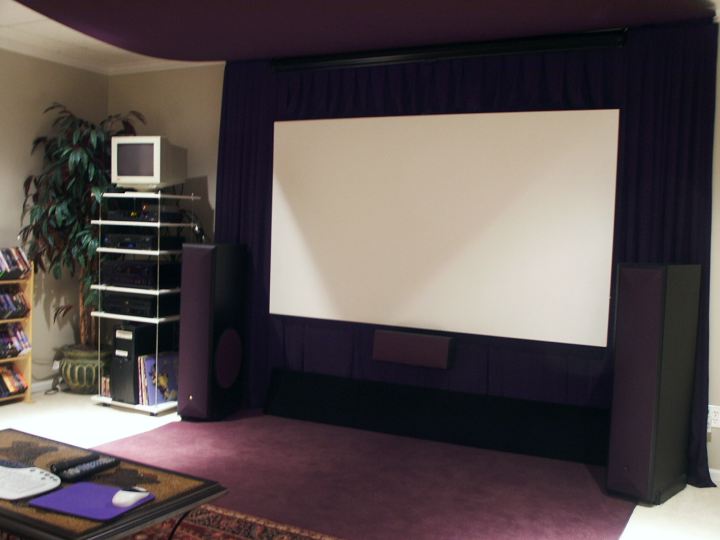 Completed anti-reflection project. The carpet looks purple, but trust me, it's black. The purple tint is from the digicam. Watching the screen with the lights off there are no distractions. Just the screen floating on the wall...